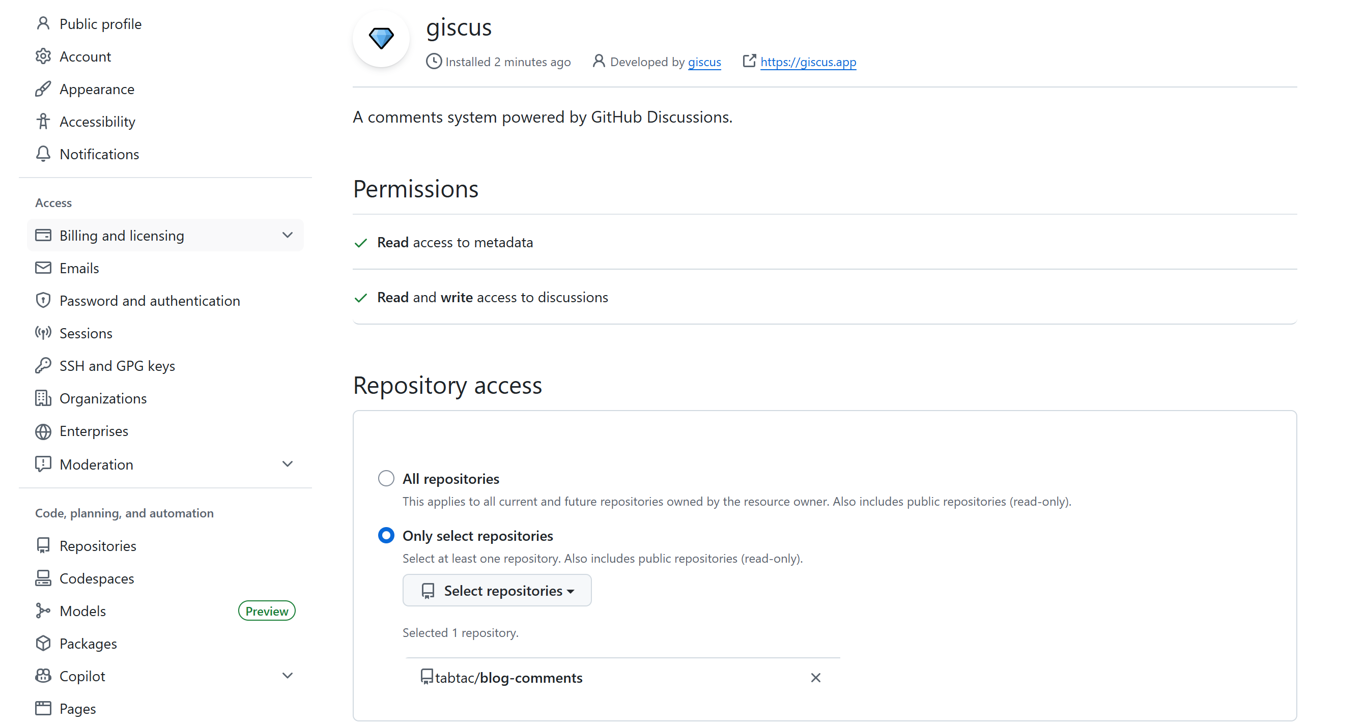 blog-comments。如果博客仓库本身就是公开的,就不用这一步的操作了。 - 安装 Giscus。在这个网址 GitHub Apps - giscus 安装 app 到对应的评论仓库,安装完成的示例如下图所示。