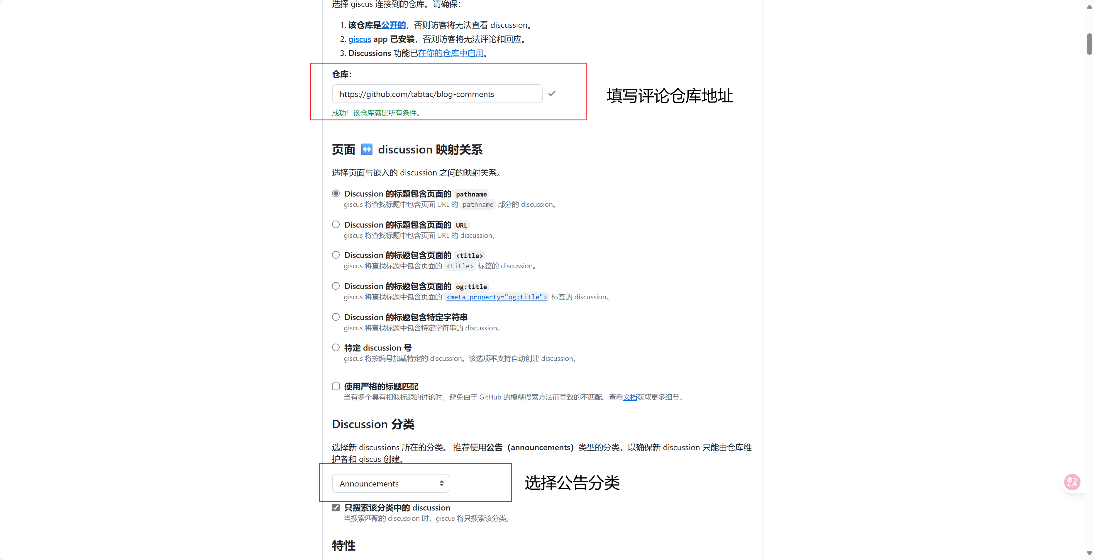 4. 生成并复制评论代码。在官方网页中 giscus 粘贴仓库地址,并选择分类为Announcements,其余设置根据喜好进行修改。你会获得类似下面的代码,注意不要泄露自己的 id 信息: