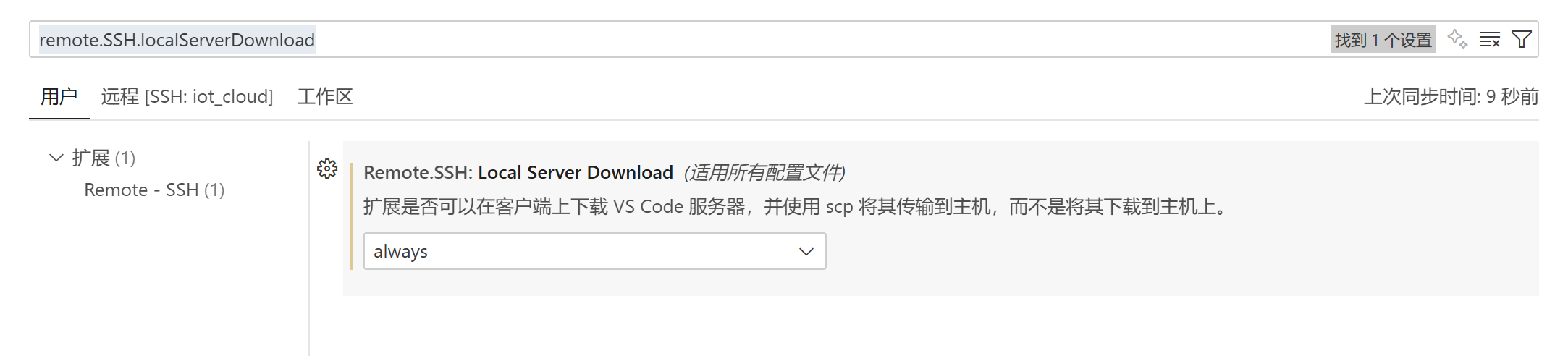 首先按照文件->首选项->设置的顺序打开设置,搜索选项 remote.SSH.localServerDownload,将设置选项改为"always",该设置的描述如下图所示: